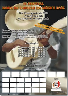 Acontece no dia 16/08/2009, o grande Festival Sertanejo da Cidade de Itapuí, o “IV FESTIVAL MODA DE CABOCLO DA MÚSICA RAÍZ”. E eu, com muita satisfação, estarei lá fazendo parte do Corpo de Jurados. Organização e apresentação dos meus amigos Marcelo Furlen e Fernando Cebola. Informações: (14) 3664-3370, 3664-8046. Tião Camargo – Bauru/SP Como chegar a Itapuí |